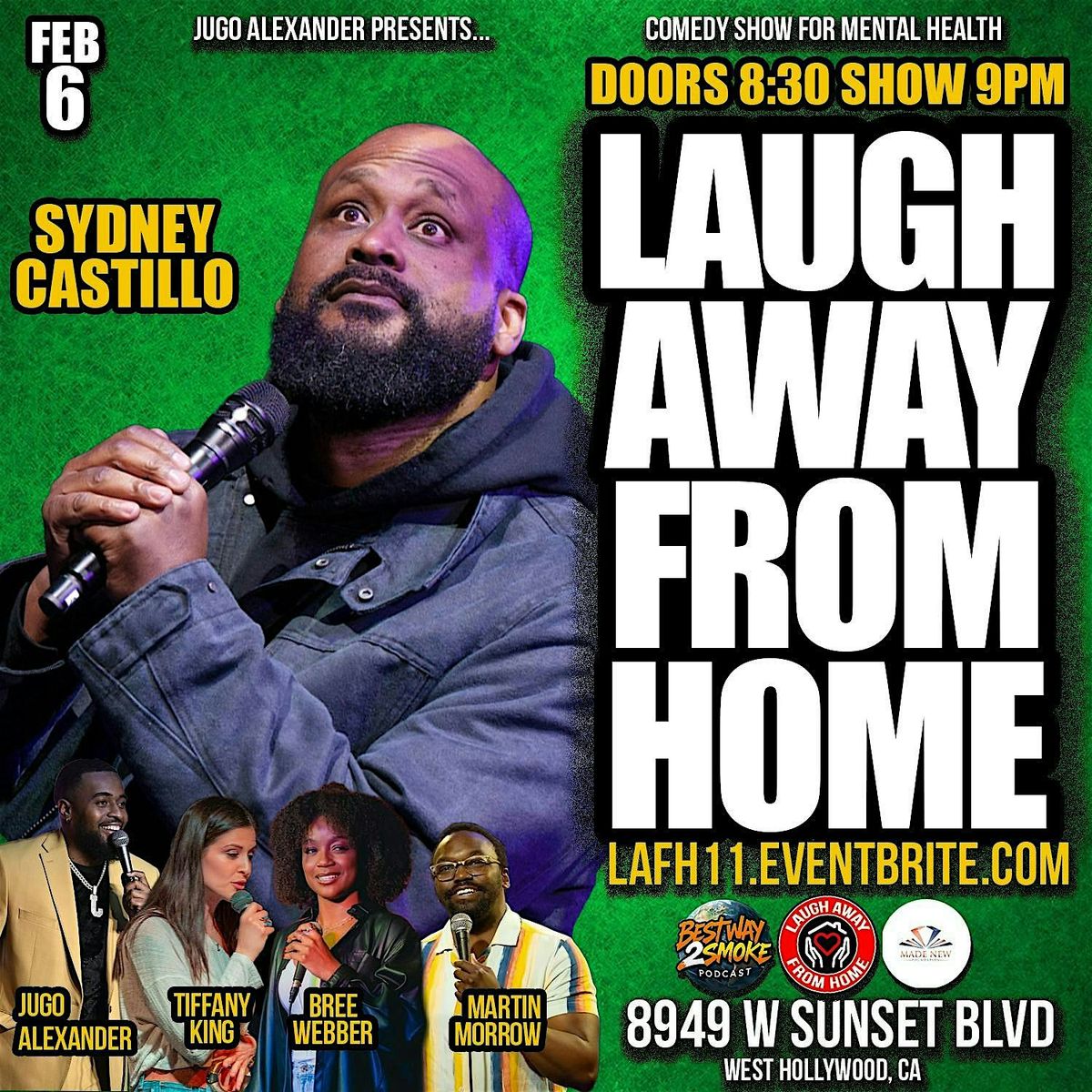 LAUGH AWAY FROM HOME COMEDY FOR BETTER MENTAL HEALTH SHOW IS PRESENTED AND HOSTED BY JUGO ALEXANDER. THIS IS THE 11TH EDITION OF THIS SHOW IN LA.