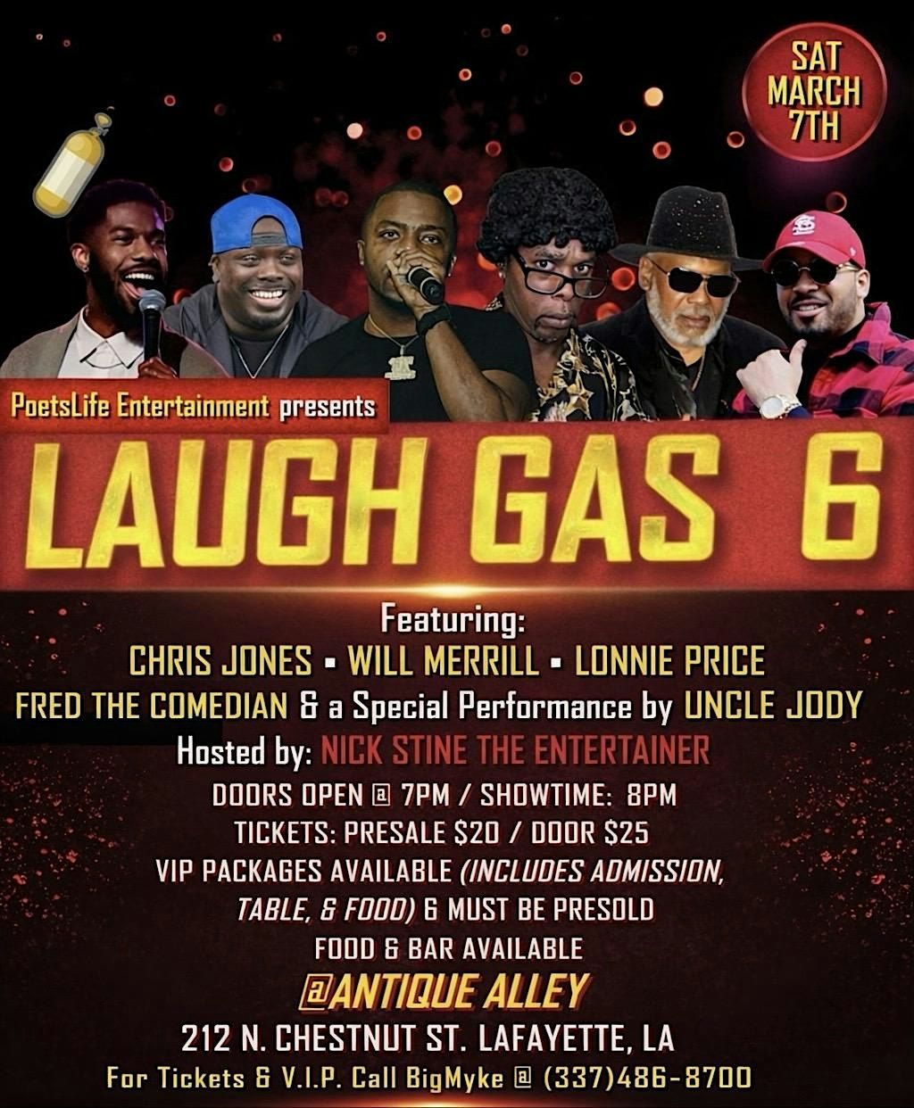 Featuring Chris Jones, Will Merrill, Lonnie Price, Jr., & Fred The Comedian. Including A Special Performance From "Uncle Jody." Hosted By Nick Stine The Entertainer. Sounds By DJ Thikk. Food By ChefBZB, & Antique Alley's Famous Signature Drinks