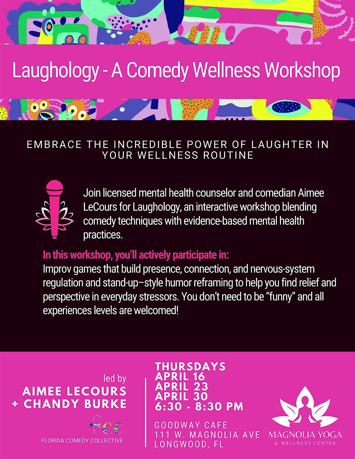 Are you ready to embrace the incredible power of laughter in your wellness routine? Join licensed mental health counselor, stand-up comedian, and improviser Aimee LeCours for Laughology, an interactive workshop blending comedy techniques with evidence-based mental health practices.