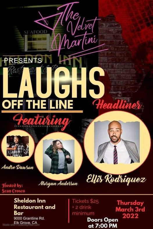 The Velvet Martini Lounge presents Laughs off the Line, featuring Andre Danson, Morgan Anderson, and Headlining Ellis Rodriguez! The Velvet Martini Lounge is located on the second floor of Sheldon Inn Restaurant and Bar. A limited menu will be available to order from throughout the show. Feel free to make a reservation at Sheldon Inn to enjoy dinner before the show!