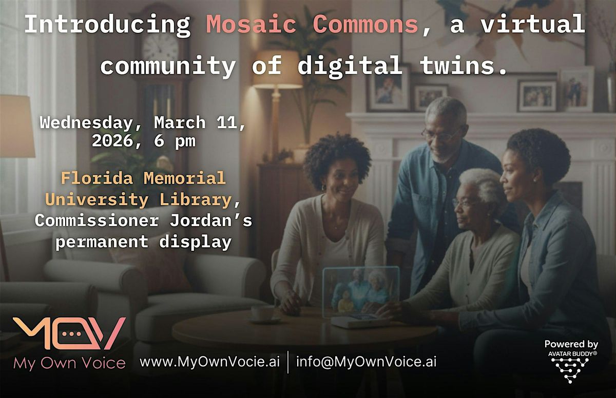 Step into the future with us at the in‑person launch of Mosaic Commons, our new universe of digital twins. Experience how lifelike digital versions of real people can preserve stories, spark new connections, and reimagine legacy in a virtual community built for creators, culture‑shapers, and visionaries. Come see the technology in action, ask questions, and be among the first to help shape this bold new space.