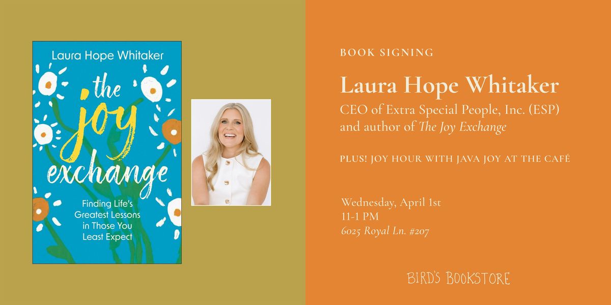 Bird's is delighted to welcome Laura Hope Whitaker on The Joy Parade Book Tour presented by Loverly Grey to celebrate her novel The Joy Exchange: Finding Life's Greatest Lessons in Those You Least Expect. Bring your copy—or buy one via the ticket link below—for a book signing, then continue the celebration in our café with a Joy Hour featuring Java Joy.