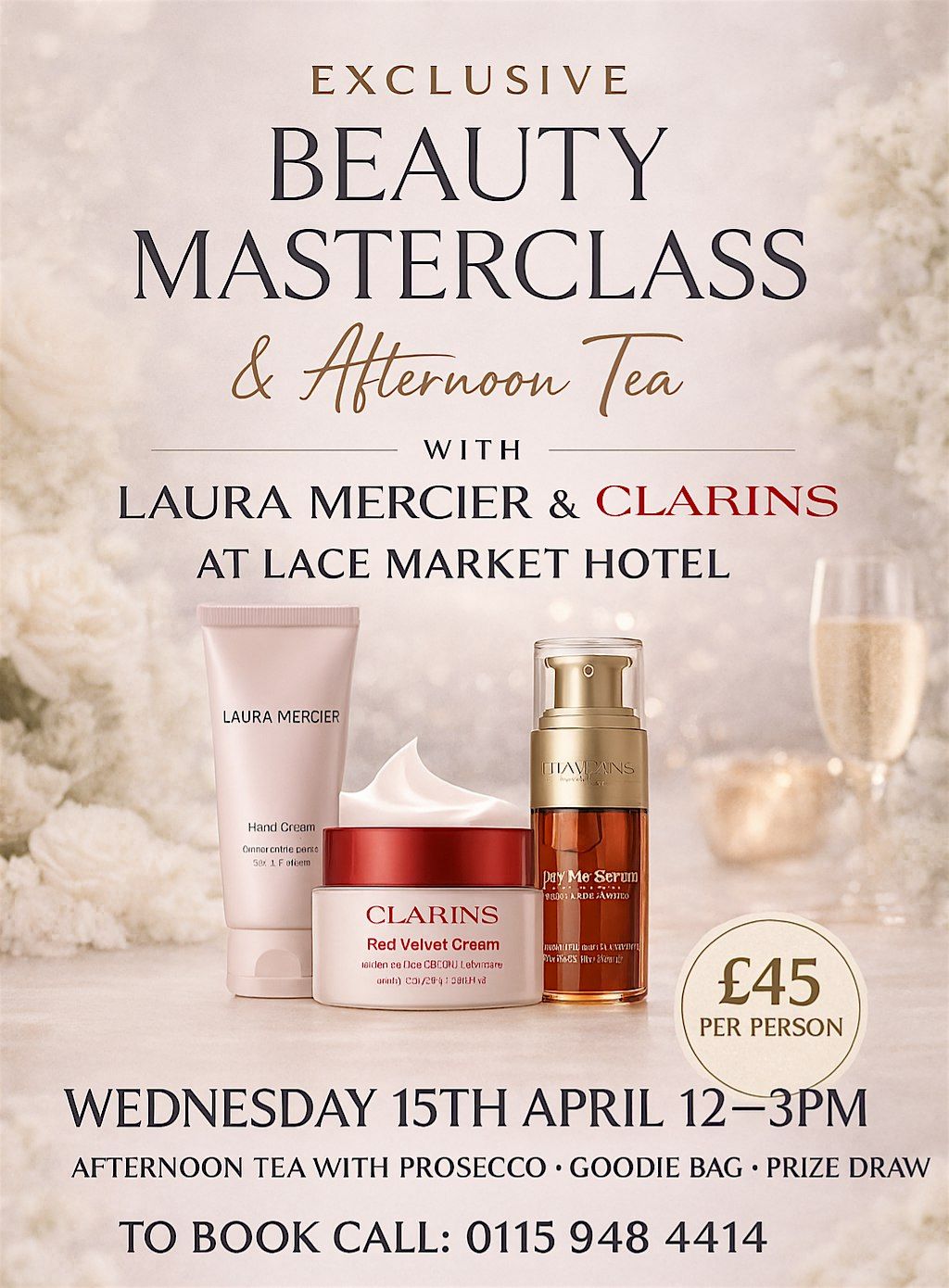 Join us for a beauty masterclass with Laura Mercier and Clarins, followed by a Afternoon Tea