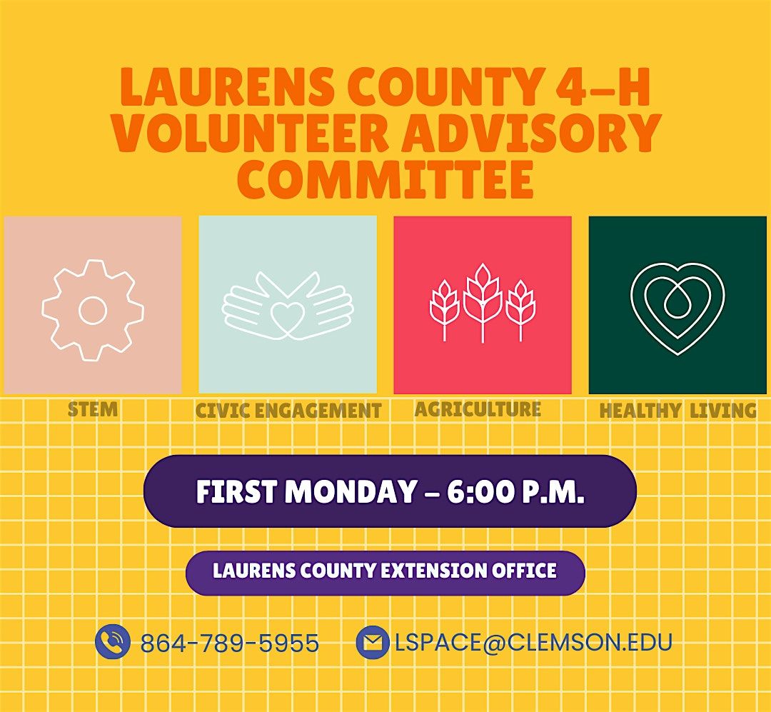 Adult volunteers passionate about 4-H in Laurens County are invited to join our Advisory Committee! This team will work together to strengthen and improve our local 4-H program. They will help to shape youth opportunities, support events, and ensure we’re meeting the needs of our community.