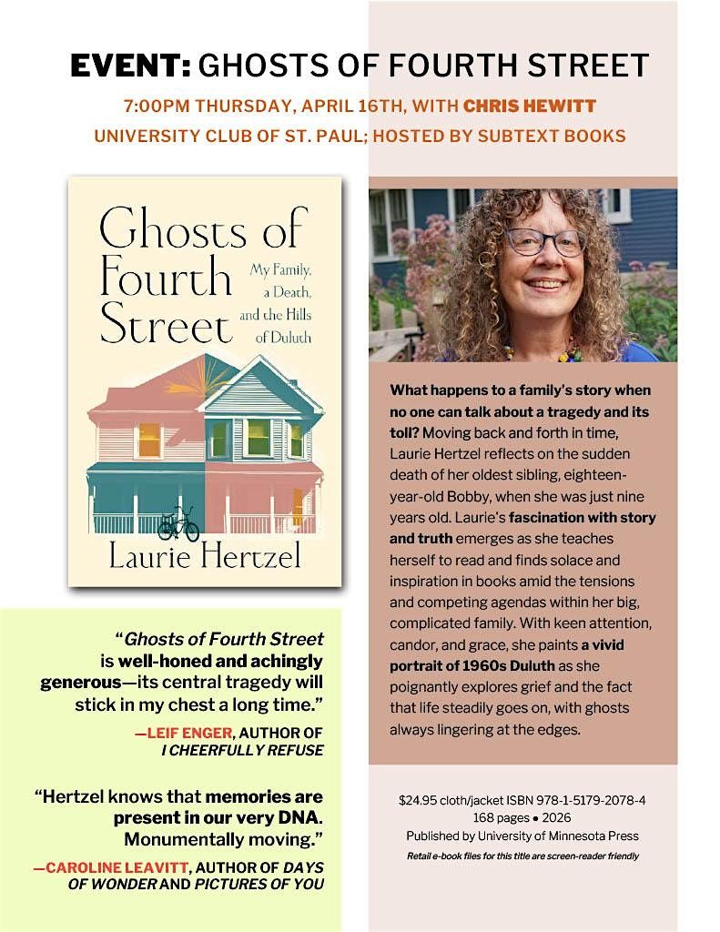 Ghosts of Fourth Street is the story of growing up in a big, complicated family in the 1960s, a family steeped in stories and myth. When the oldest son dies, everything changes. The story is told through the eyes of nine-year-old Laurie, a solitary child sustained by books.