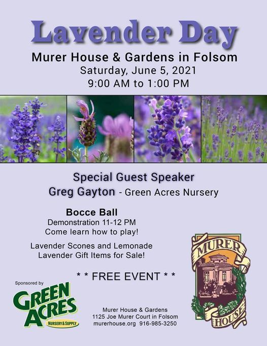 Come see our lavender in full bloom! Special guest speaker Greg Gayton from Green Acres Nursery & Supply, lavender plants, gifts, scones and cookies for sale! Try your hand at bocce! FREE!