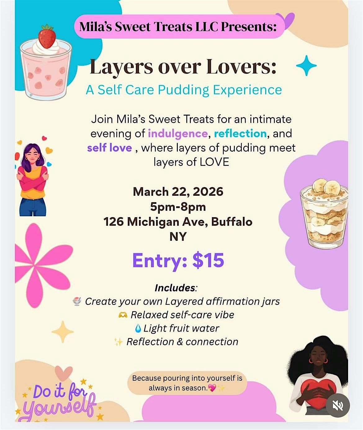 This event is all about pouring into yourself while enjoying something sweet. Instead of just eating dessert, you’ll create your own layered pudding affirmation jar, where each layer represents intention, self-love, and the way you nurture yourself.