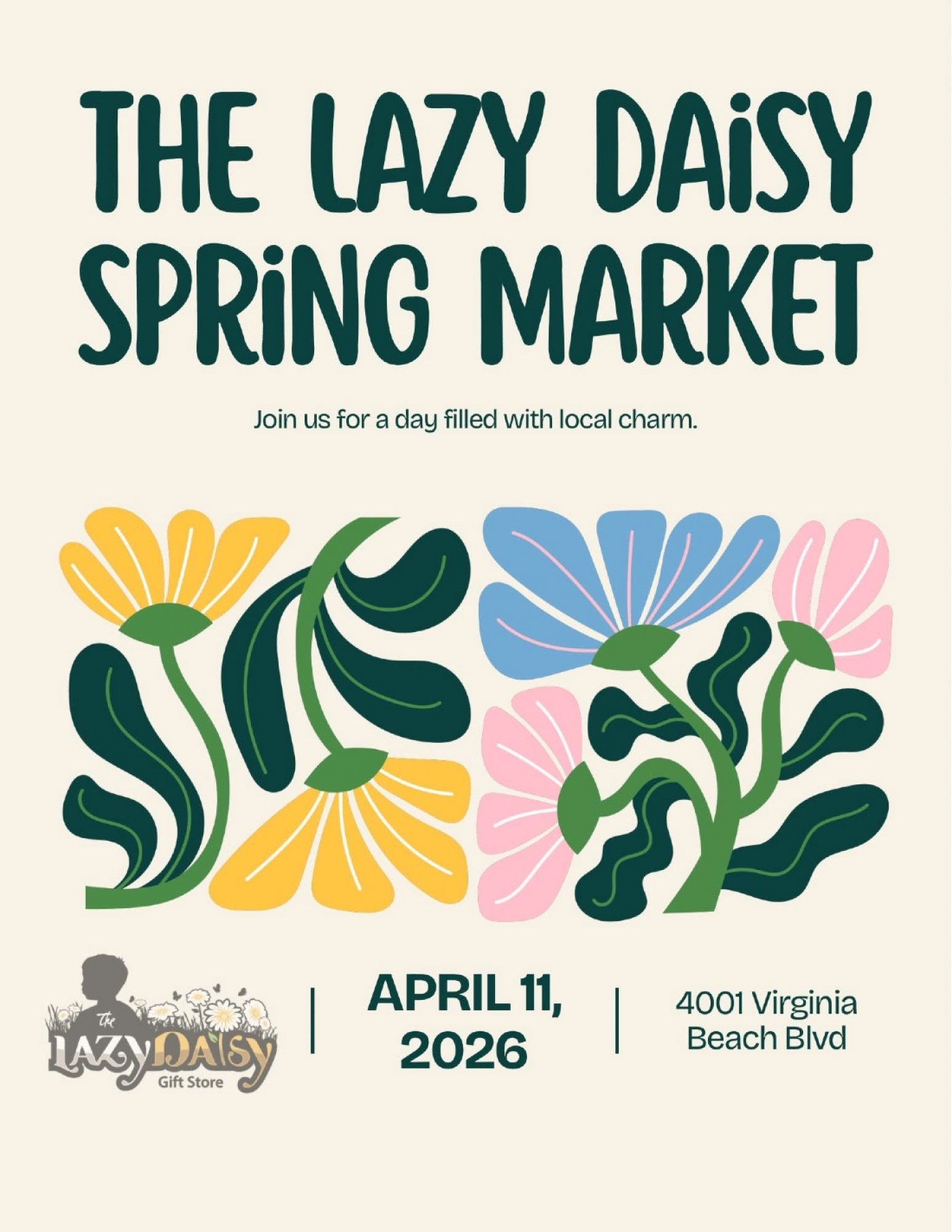 Join us for a family friendly Spring market featuring local Lazy Daisy vendors. Farm fresh eggs, local baked goods, local authors, crafts, home decor, jewelry, and more. Enjoy shopping the store with more deals inside!