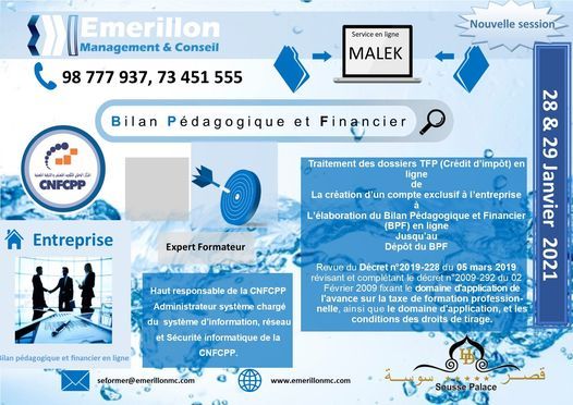 Session de formation du bilan Pédagogique et Financier en ligne sera planifiée avec le cabinet Emerillon Mangement et Conseil pour les 28 & 29 Janvier 2021, ayant pour thème :