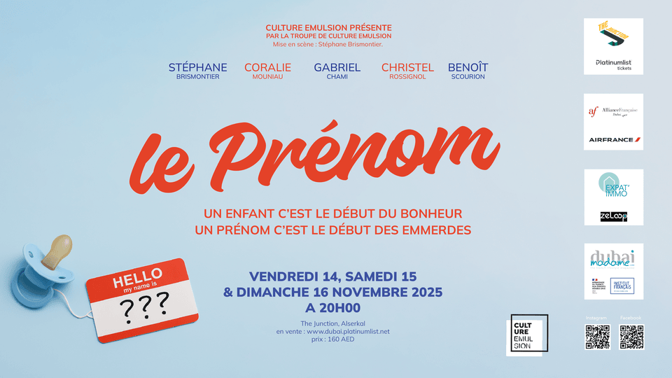 By taxi: You can also take a taxi to Al Serkal Avenue from anywhere in Dubai. It's a famous destination and most drivers would be familiar with its location. LA TROUPE DE CULTURE EMULSION proudly presents : LE PRENOM.