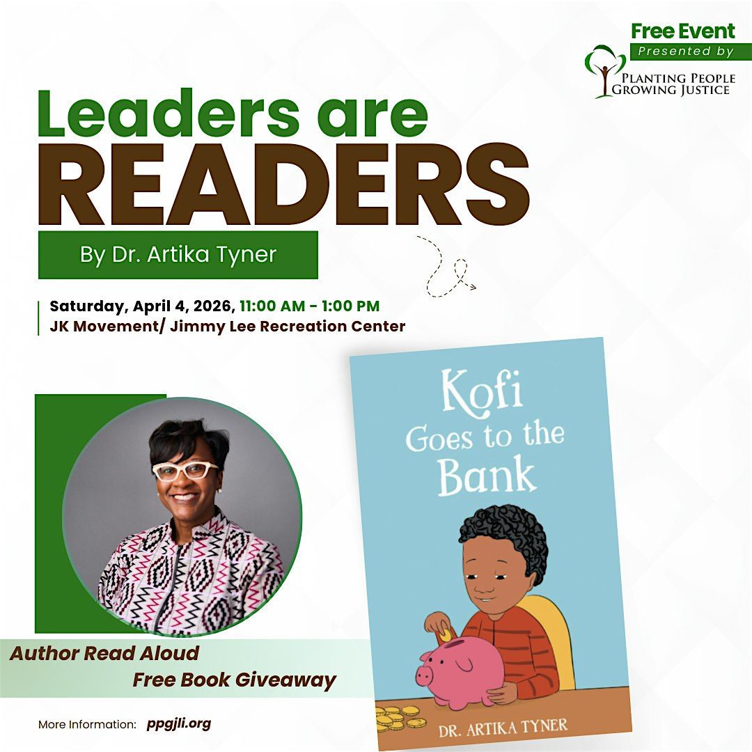 Join Leaders are Readers and unlock your child's growth through the power of literature, fostering leadership skills and a love for reading. Through captivating storytelling and interactive activities, watch as their imagination soars and their confidence grows. This program will feature Dr. Artika Tyner, author of the book Kofi Goes to the Bank. Bring the whole family out for some literary fun, food, and book giveaways.