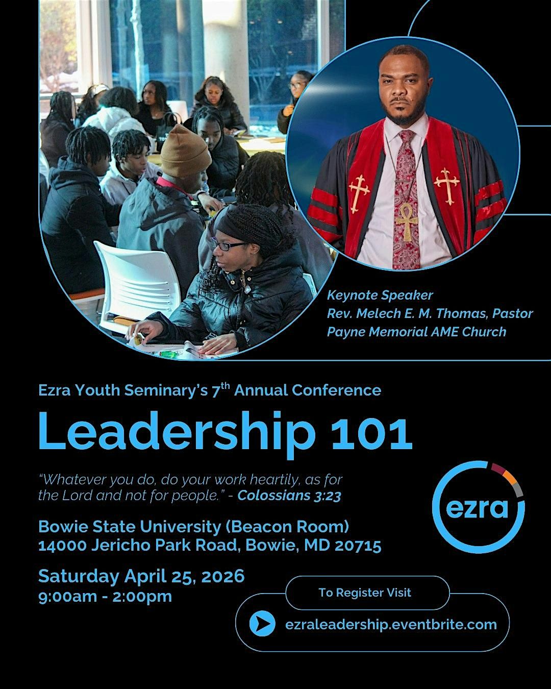 Ezra Youth Seminary invites you to its 7th Annual Leadership Conference, "Leadership 101". Our theme scripture will be Colossians 3:23, "Whatever you do, do your work heartily ,as for the Lord and not for people". The overall price includes Conference Plenary, Small Groups, and Luncheon. We hope to see you there!
