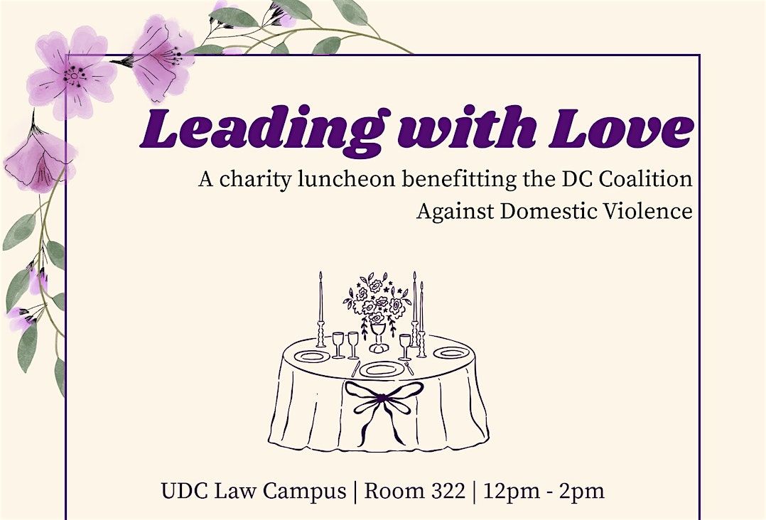 We would like to invite you to “Leading with Love”, a charity luncheon on March 21, 2026, from 12pm to 2pm on the UDC Law campus in Room 322. We are continuing our efforts to raise money for the DC Coalition Against Domestic Violence, and we would love for you to help us in our mission to raise $5000. There will be food and drink provided as well as speakers and open discussions about how we can best serve survivors in our community. Please RSVP by March 14th at 11:59pm.