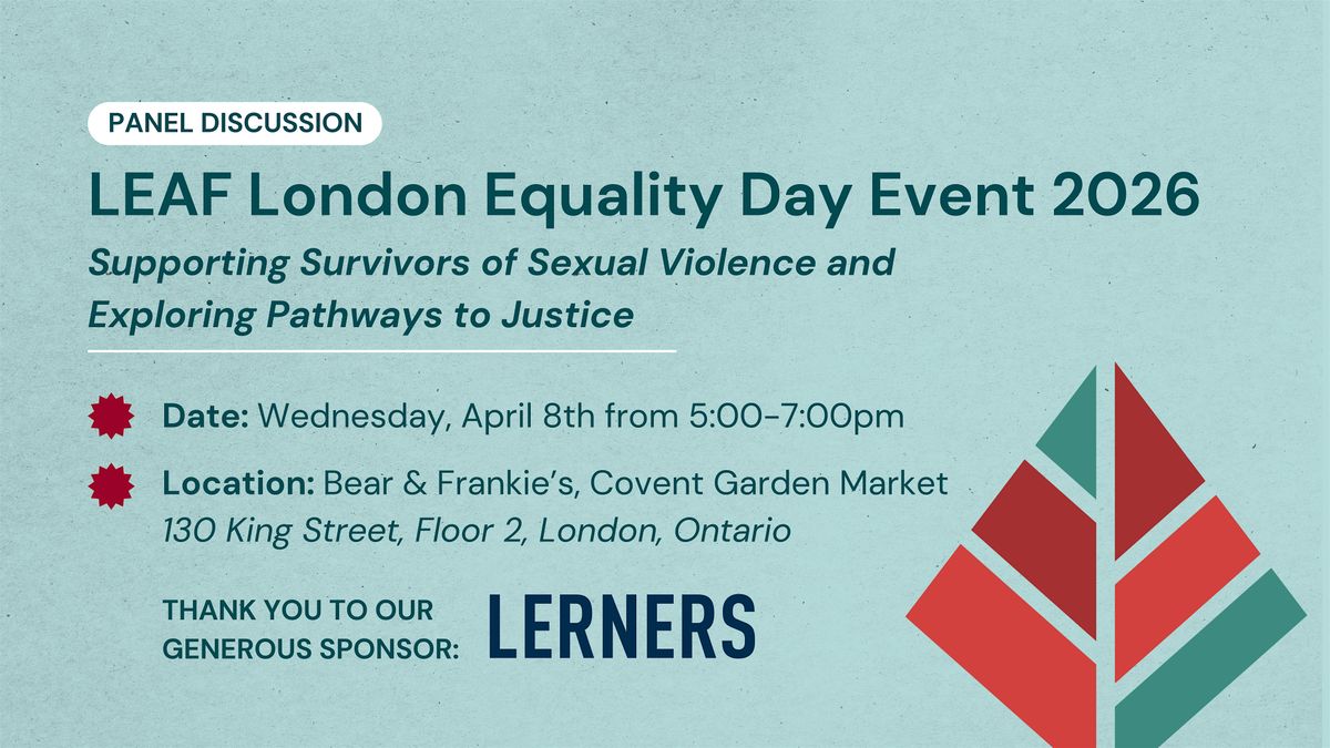 Every year, LEAF celebrates Equality Day across Canada – commemorating the historic implementation of the Sections 15 and 28 in the Canadian Charter of Rights and Freedoms, enshiring consitutional equality for all under the law. To mark this ocassion, LEAF London invites you to attend an evening event at Bear & Frankie's (Downtown London) to engage, connect, and learn with others in the community. Drinks and appetizers will be provided at the event.