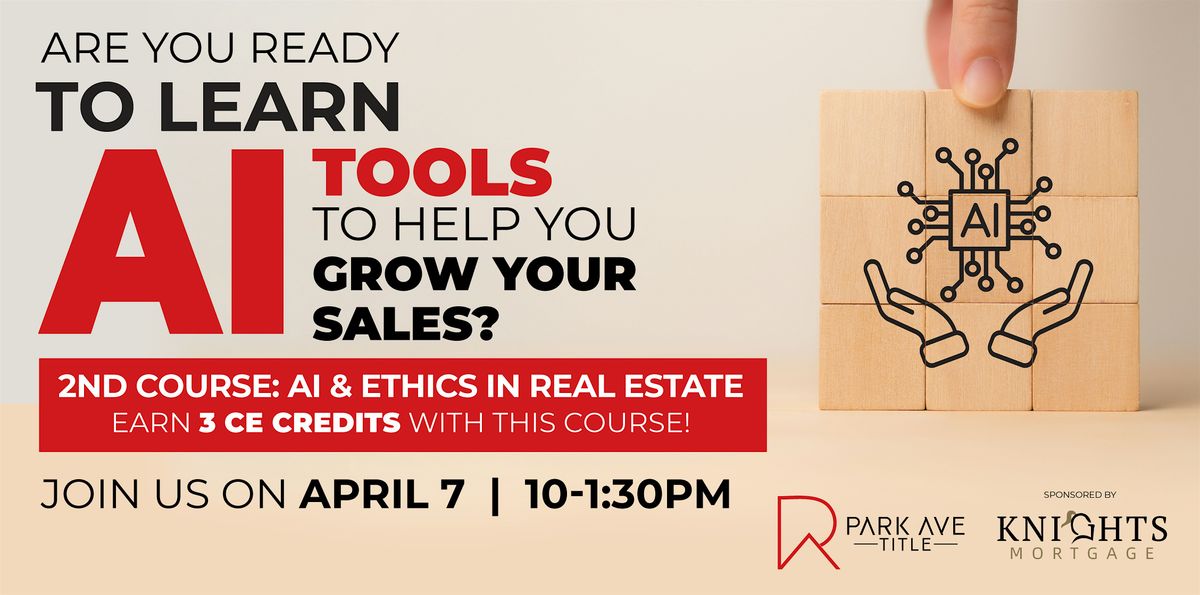 Are you ready to learn AI tools to help you grow your real estate sales? Join us on Tuesday, April 7th from 10-1:30pm. We will start with a 30 min AI Tools tutorial and then move in to "Clients, Customer, Consumers and AI: Understanding the Foundations of Ethics and Real Estate" You'll earn 3 CE credits with this course! Food and Refreshments will be provided. Space is Limited so Register today!