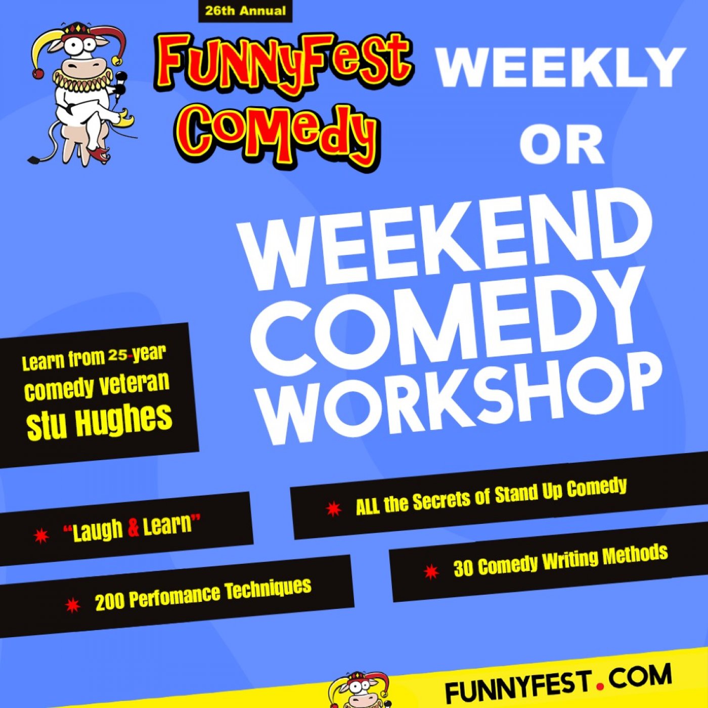 Learn Comedy Now and Save $100 with our new year and new you discount! This amazing “Laugh and Learn” Comedy Workshop will be transformative for you. The course is delivered by a 25 year comedy pro, who will teach you the Secrets of Stand Up Comedy: Learn 200 Performance Techniques and 30 Comedy Writing Methods. The standup comedy workshop will give you immense self confidence and improvement in your public speaking and presentation skills. Learn from the experts, have fun, deliver the funny now. The comedy workshop is 100% guaranteed to significantly provide value to you or you can request a refund. Act now as there are limited student spots remaining. You can take the course over a WEEKEND or WEEKLY. Plus you receive a video of you performing and a “Graduation Showcase” (That includes 2 headline comedians bookending the student funny).
