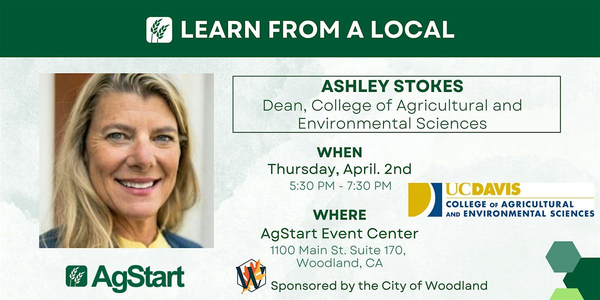 Learn from a Local is an on-going speaker series hosted by AgStart, a non-profit organization supporting entrepreneurs advancing innovation in agriculture and food technology (AgriFoodTech). Typically on the 1st Thursday evening of every month, AgStart hosts a local speaker from the AgriFoodTech sector to speak on a topic relevant to our entrepreneurial ecosystem. Our goal is to offer a space to connect with local individuals and learn from leaders in our local AgriFoodTech sector on topics relevant to our AgStart community. Events take place in our AgStart Event Center: 1100 Main St., Suite 170, Woodland, CA 95695. An approximate event agenda is detailed above.
