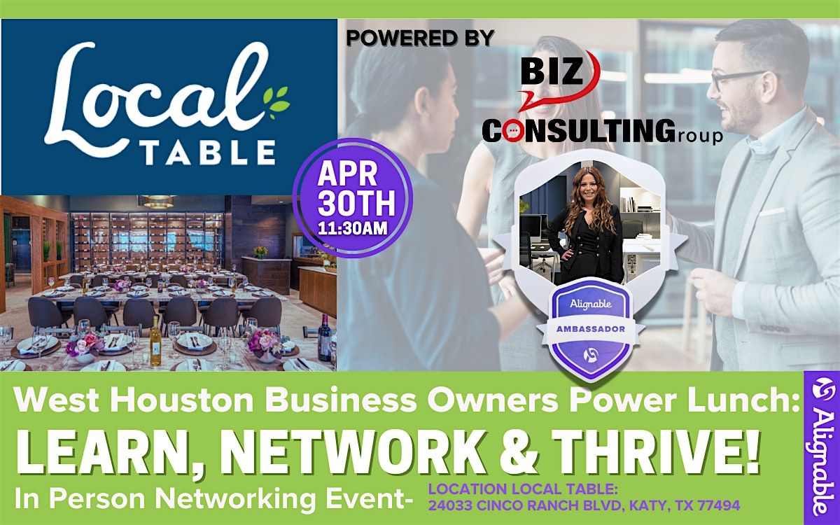 Join us on April 30th at 11:30 AM for the West Houston Business Owners Power Lunch at Local Table in Katy. This is your chance to step away from the everyday routine and spend time with motivated business owners, entrepreneurs, and professionals who believe in the power of face-to-face connection.