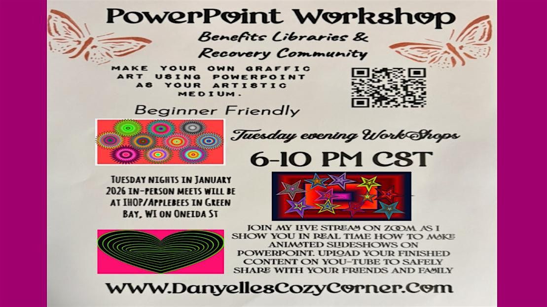 A fun new fund raiser to benefit Milwaukee and other nationwide library systems & recovery communities by creating sober living scholarships. Join my weekly PowerPoint Workshops and together we’ll learn a fun new pastime, while meeting many new friends. Meetings will always be live through a Zoom feed and in-person locales will vary. January and February, 2026 in-person meetings will be held at IHOP/Applebee’s in Green Bay, Oneida Street or join my live Zoom feed.