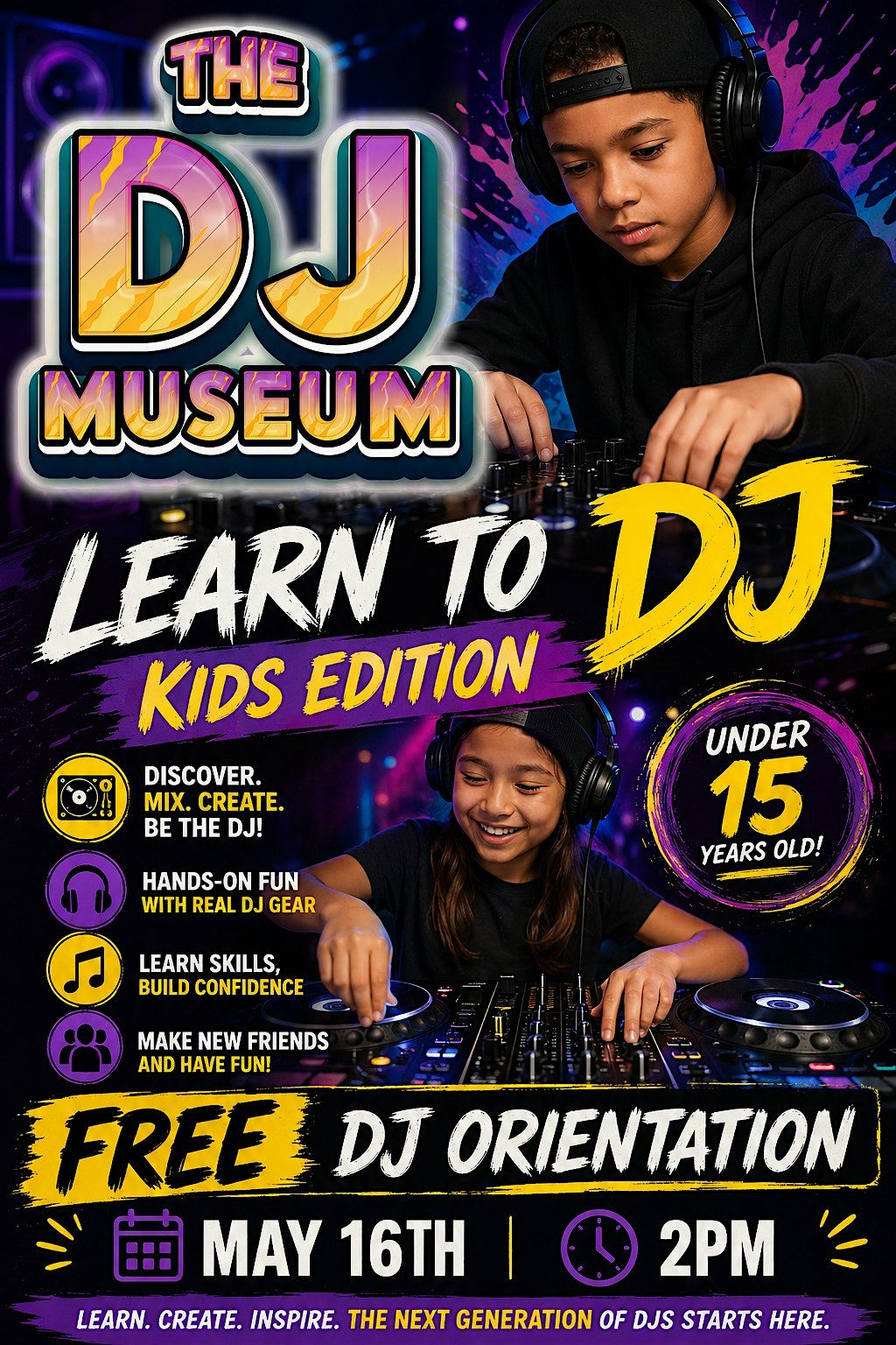Get ready for a super fun FREE DJ Orientation just for kids at The DJ Museum! This in-person event is perfect for young music lovers eager to spin some tunes and learn the basics of DJing. Come join us to explore cool DJ gear, mix tracks, and have a blast with other future DJ stars. Don't miss out on this awesome chance to start your DJ journey in a friendly and exciting space!