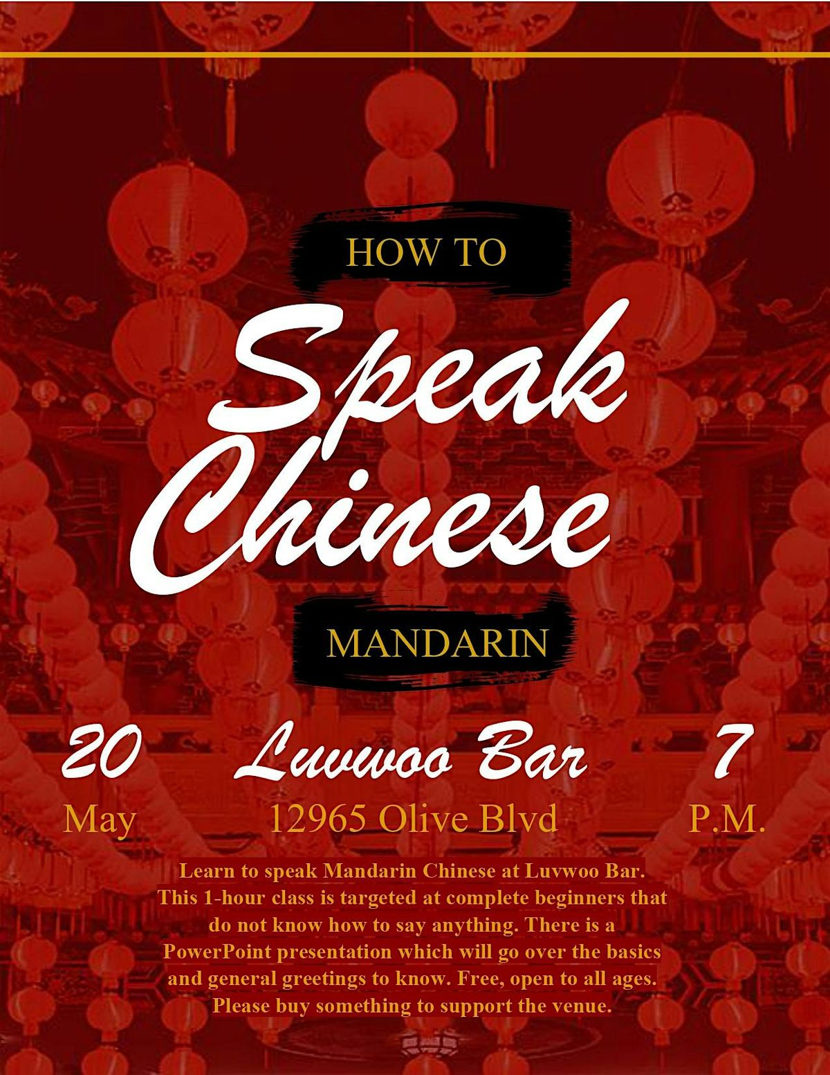 Learn to speak Mandarin Chinese at Luvwoo Bar. This 1-hour class is targeted at complete beginners that do not know how to say anything. There is a PowerPoint presentation which will go over the basics and general greetings to know. Free, open to all ages. Please buy something to support the venue.