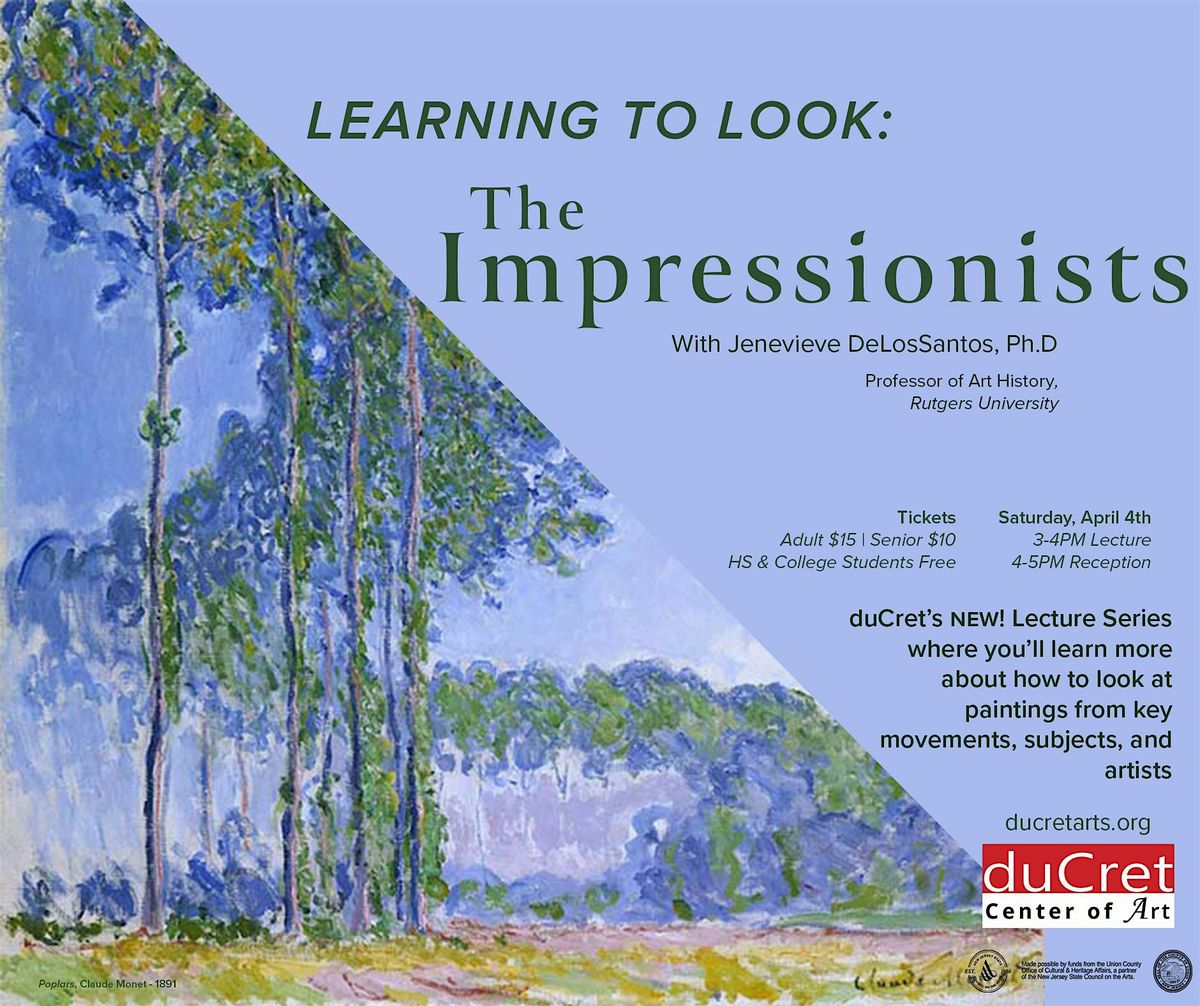 In this NEW! Lecture series, Jenevieve DeLosSantos, Ph.D, will talk about the Impressionist art movement, the artists central to it, and how to look at, identify and appreciate the characteristics of Impressionist artwork. Her talk is from 3-4PM and from 4-5PM will be a reception with refreshments and an open forum to discuss.