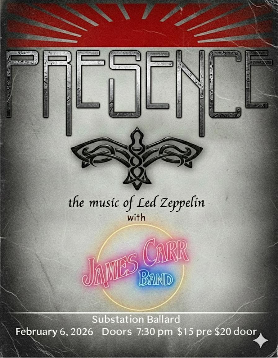 Join us again at the Substation for an evening of original and classic Rock, the James Carr Band and Led Zeppelin tribute Presence.About this Event