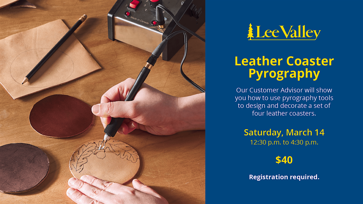 Description: Learn how to use pyrography tools to design and decorate a set of four leather coasters with guidance from our Customer Advisor.