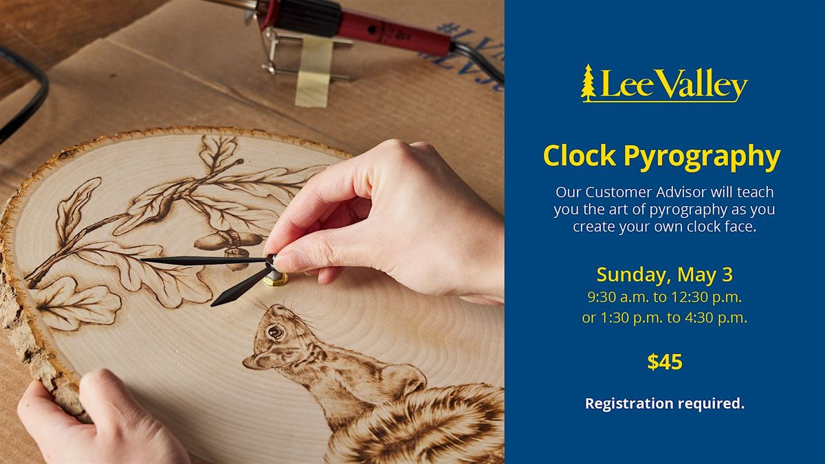 Description: Have you ever wanted to try wood burning? Our Customer Advisor will teach you the basics of the art while you customize a live-edge wooden clock using pyrography techniques.
