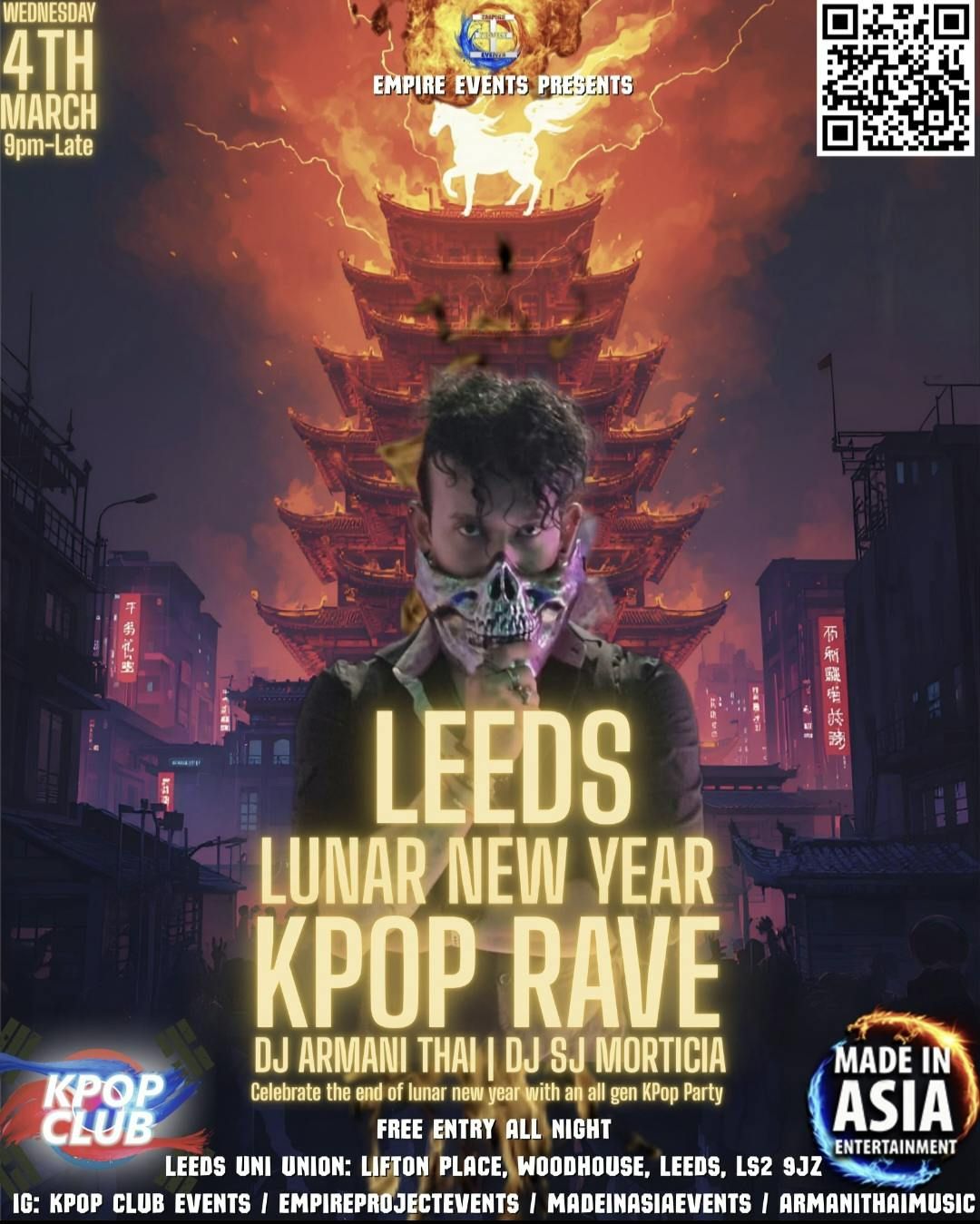🔥🐎FREE UNIVERSITY OF LEEDS INTERNATIONAL LUNAR NEW YEAR KPOP PARTY🐎🔥KPOP'D | LEEDS BIGGEST KPOP PARTY | Lunar New Yeae Party with DJ Armani Thai & SJ Morticia | Yorkshires biggest KPop Club Night | KPop KHipHop EDM | Free Entry | 4/3/26🔥LUNAR NEW YEAR: YEAR OF THE FIRE HORSE🐎A time of new beginnings, entering the new year with strength and ambitiob. Time for the Fifth KPop'D of the Year and Leeds biggest KPop Party to return for the second event of 2026 and semester 2! We are back with another FREE KPOP PARTY to celebrate the end of exams! Presenting the LEEDS LUNAR NEW YEAR CLUB NIGHT,. We join together with the University of Leeds with our very own DJ @armanithaimusic and DJ SJ Morticia hosting the Fifth Leeds University Union KPop event of the year on Wednesday 4th March. In celebration, we will be playing all of the biggest favourites from all generations of KPop🎶The theme? 🧧