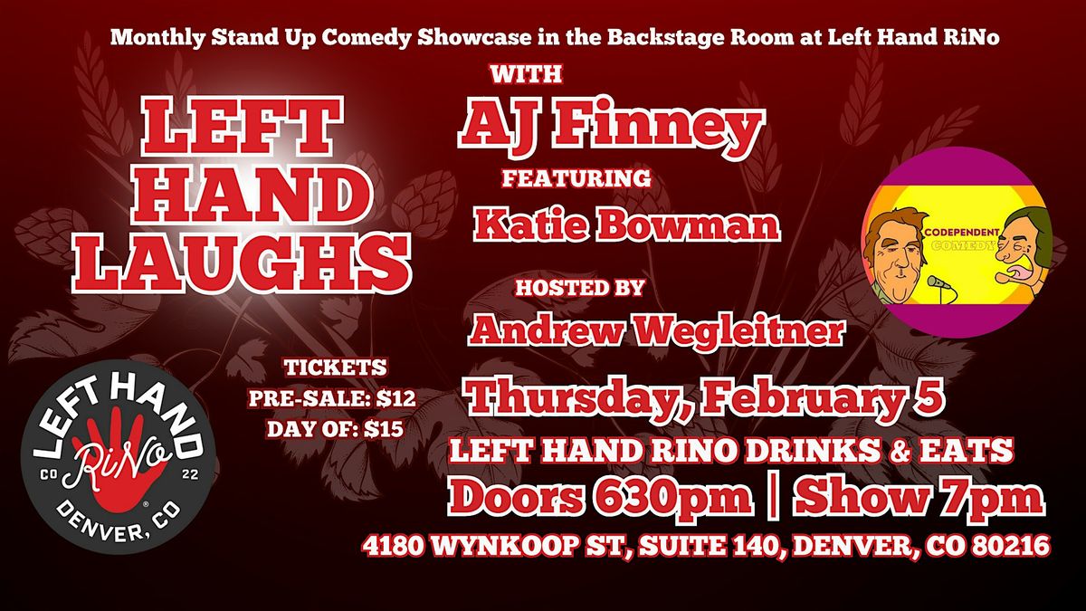 Enjoy an evening of standout stand up comedy, presented by Codependent Comedy, on Thursday, February 5 from headliner AJ Finney featuring Katie Bowman. Hosted by Andrew Wegleitner. Indulge in Award winning Left Hand craft beer, signature cocktails, & dinner in Left Hand RiNo Drinks & Eats' Backstage room.
