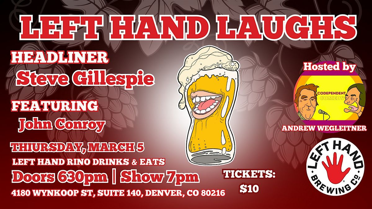 Enjoy an evening of standout stand up comedy, presented by Codependent Comedy, on Thursday, March 5 from headliner Steve Gillespie featuring John Conroy. Hosted by Andrew Wegleitner. Indulge in Award winning Left Hand craft beer, signature cocktails, & dinner in Left Hand RiNo Drinks & Eats' Backstage room.