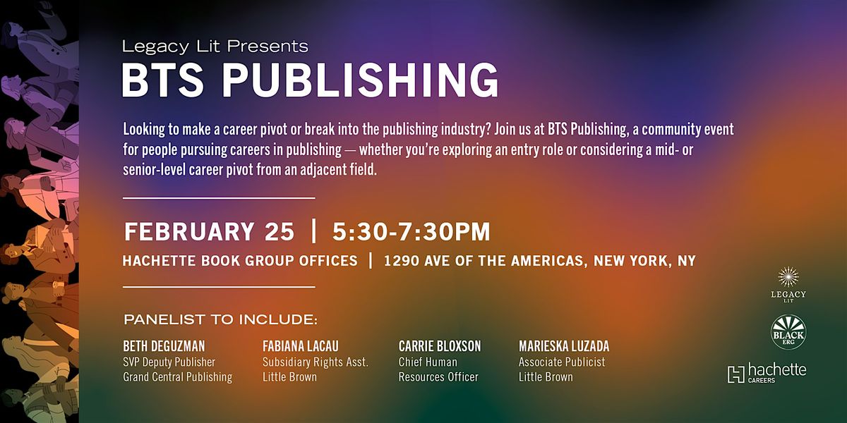 Legacy Lit and the Black ERG at Hachette invite you to BTS Publishing, a community and networking event geared towards pursuing a career in publishing—whether you’re exploring an entry role, considering a mid- or senior-level career change, or interested in contracted work with a major publisher.