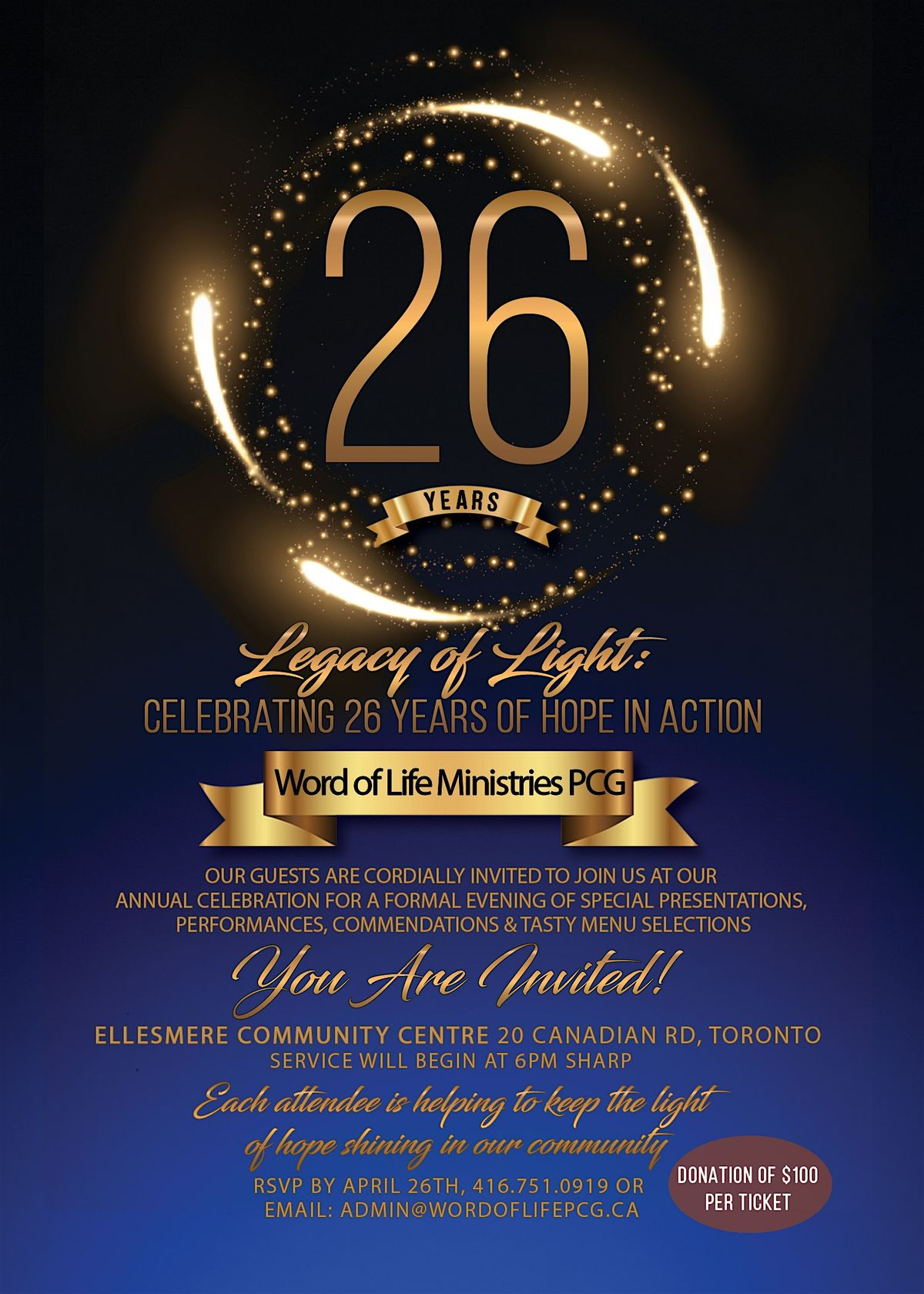 Join us for an unforgettable evening as Word of Life Ministries PCG celebrates 26 years of impact, service, and transformation within the Scarborough community and beyond.