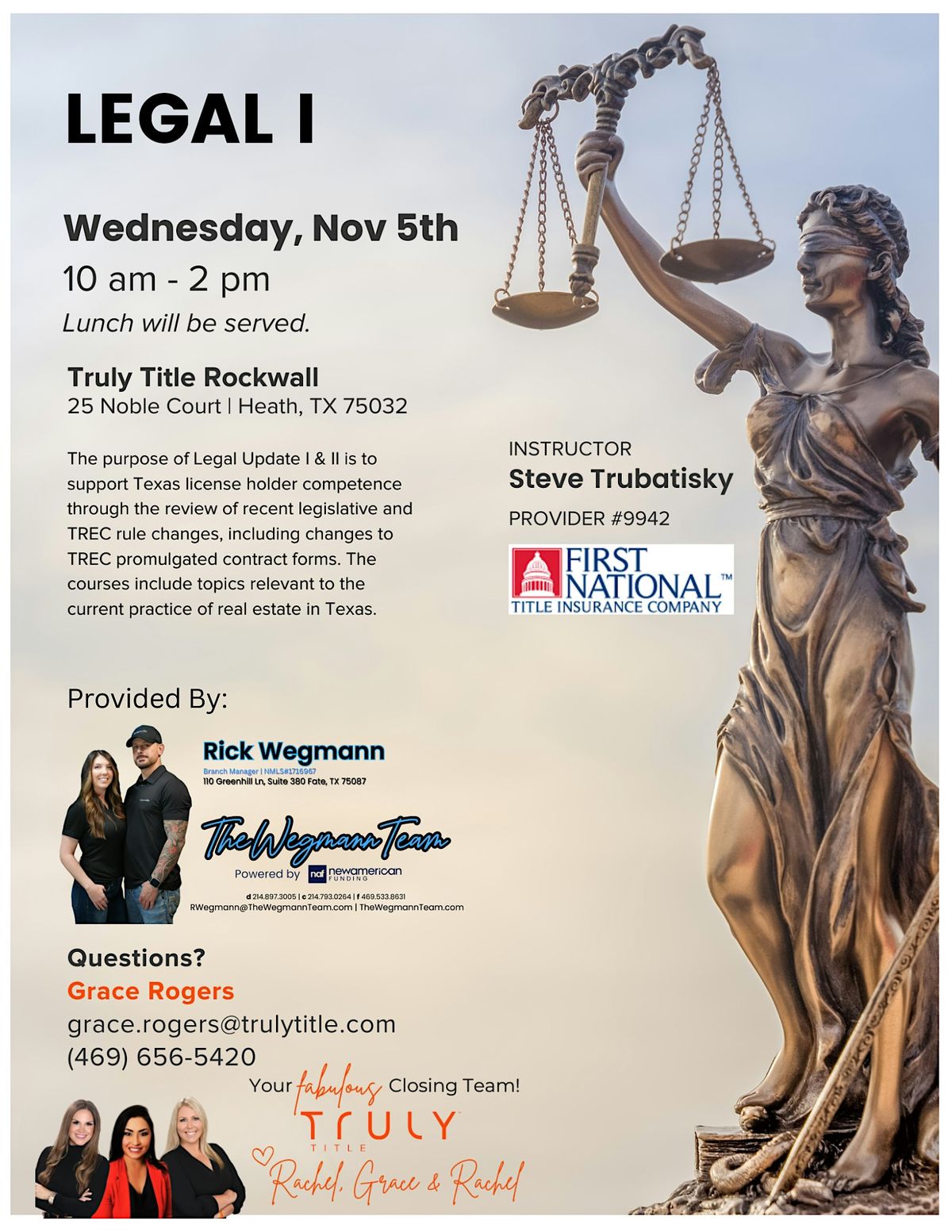 Legal I - Check in is from 9:30am to 10am. Class will start at 10am. Lunch will be provided. Cost of course is $40.