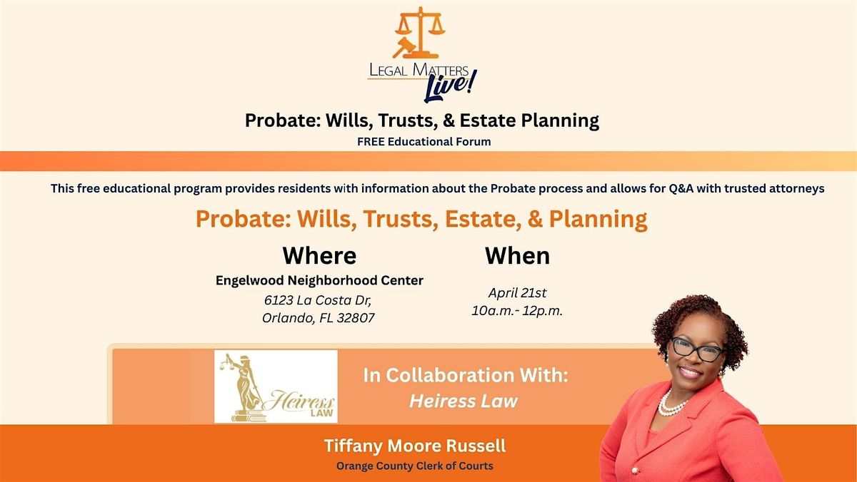 The Orange County Clerk of Courts is hosting a free Legal Matters Live forum to provide information and answer questions about Probate: Wills, Trusts, and Estate Planning.