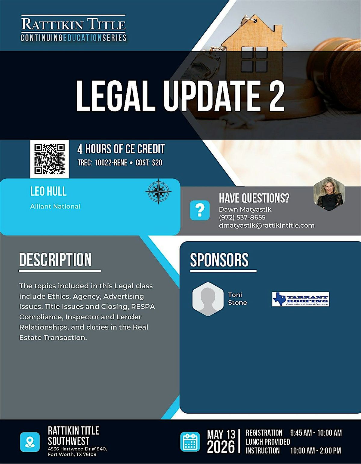 The topics included in this Legal class include Ethics, Agency, Advertising Issues, Title Issues and Closing, RESPA Compliance, Inspector and Lender Relationships, and duties in the Real Estate Transaction.
