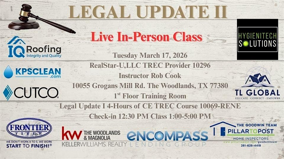 Legal Update II TREC Course 10069-RENE This 4 hour course is mandatory for all license holders every 2 years. Chapter 1 Agency. Chapter 2 TREC Disclosures. Chapter 3 Representing Veterans and Military Members. Chapter 4 The Real World: Enforcement, Case Studies and Commission Priorities.