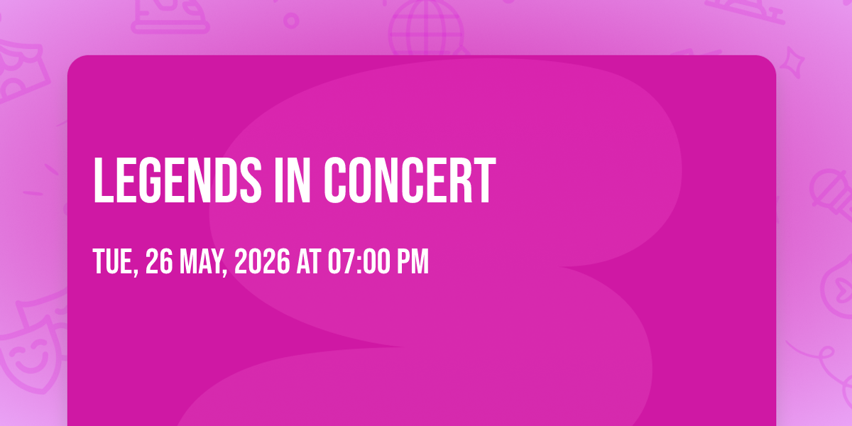 🎉 Welcome to Legends in Concert, where the impossible becomes possible and dreams take flight! 🏛️ Join us at Legends in Concert Theater in the heart of Myrtle Beach, SC for an event that will redefine your expectations. 📅 On September 4th, 2026 at 07:00 PM, witness the transformation of space and time into something truly magical. ✨ It's a curated experience combining the best of innovation, entertainment, and community spirit, creating moments that will be remembered for years to come. Whether you're a first-time visitor or a seasoned enthusiast, prepare to be amazed. 🎊 Book now to ensure your place in this unforgettable experience!http://maps.seatics.com/LegendsinConcertTheater_Endstage_2025-12-30_2025-12-30_2129_12302025_214715_SVGC_tn.png
