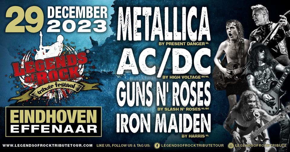 Op vrijdag 29 december 2023 komt de internationale LEGENDS of ROCK Tribute Tour naar poppodium Effenaar in Eindhoven voor wederom een monsterlijke editie van LEGENDS of ROCK Tribute Festival! Op het gerenommeerde podium van de Effenaar (mainhall) zullen onze No. 1 tributebands van AC/DC, Metallica, Guns N’ Roses en Iron Maiden alle hits en de beste albumsongs van hun muzikale helden over het publiek uitstorten. Samen met spectaculaire lichtshows en vele special effects zorgen zij voor een aaneenschakeling van dynamische shows en de ultieme ‘Live In Concert’-beleving.? LEGENDS of ROCK Tribute Festival