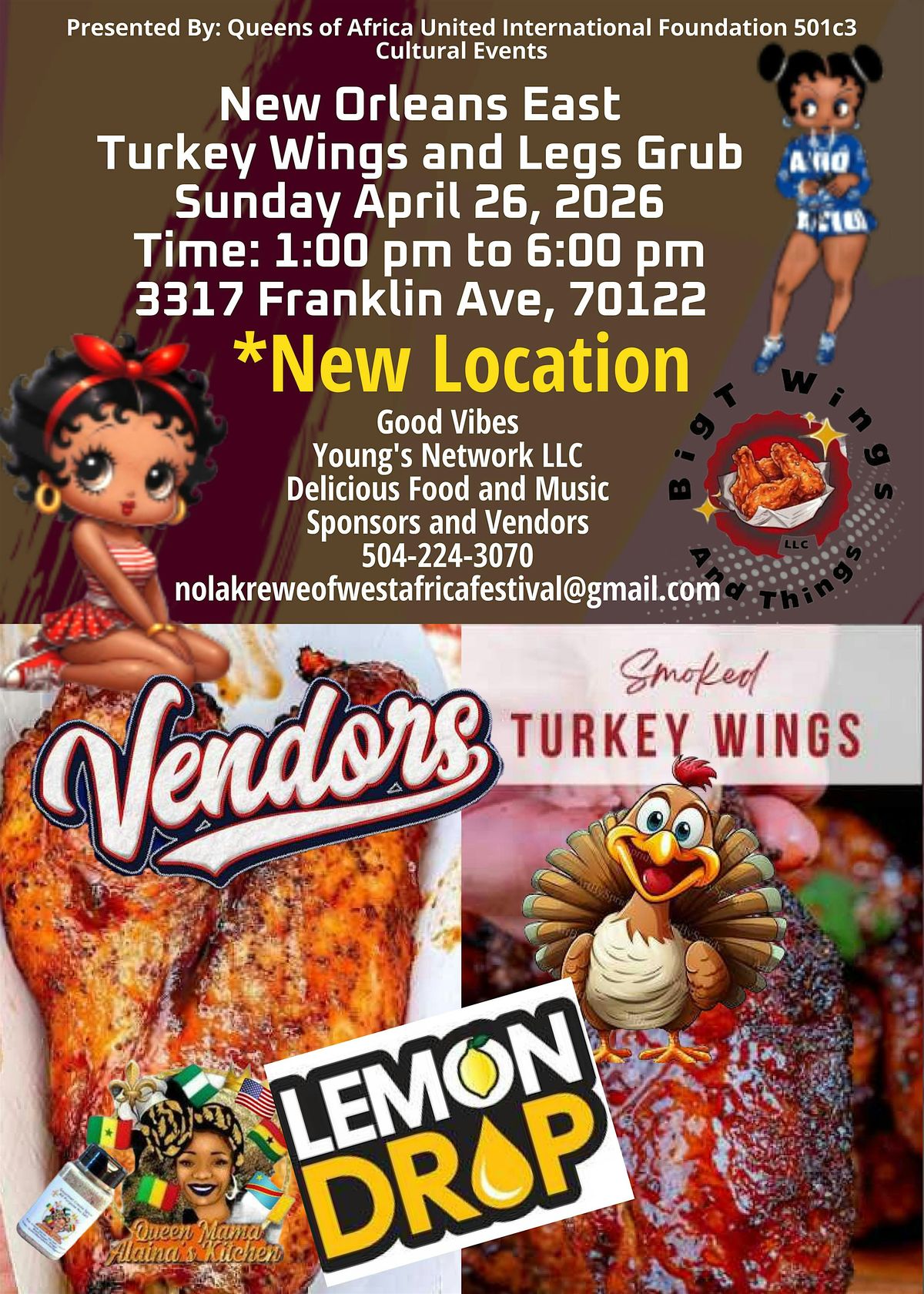 Get ready to feast at the New Orleans East Turkey Wings, Legs Grub with sweet Lemon Drop Beverages Sunday April 26, 2026! It's an in-person event where you can enjoy a variety of mouth-watering turkey wings and legs, all in a fun, laid-back atmosphere. Bring your friends, come hungry, and savor some delicious eats while soaking up the vibrant local Music vibes and entertainment. Don't miss out on this tasty celebration right in the heart of New Orleans !