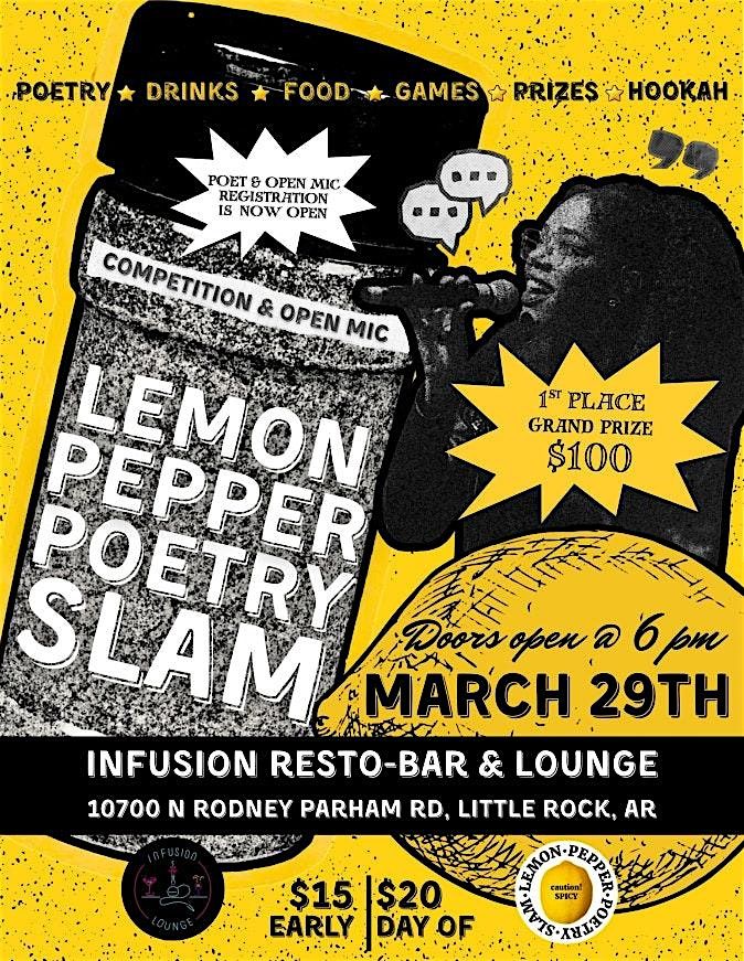 DISCLAIMER: Lemon Pepper Poetry Slam encourages participants to present their original work. As a result, poems may contain strong language and explore difficult or NSFW topics. Discretion is advised.
