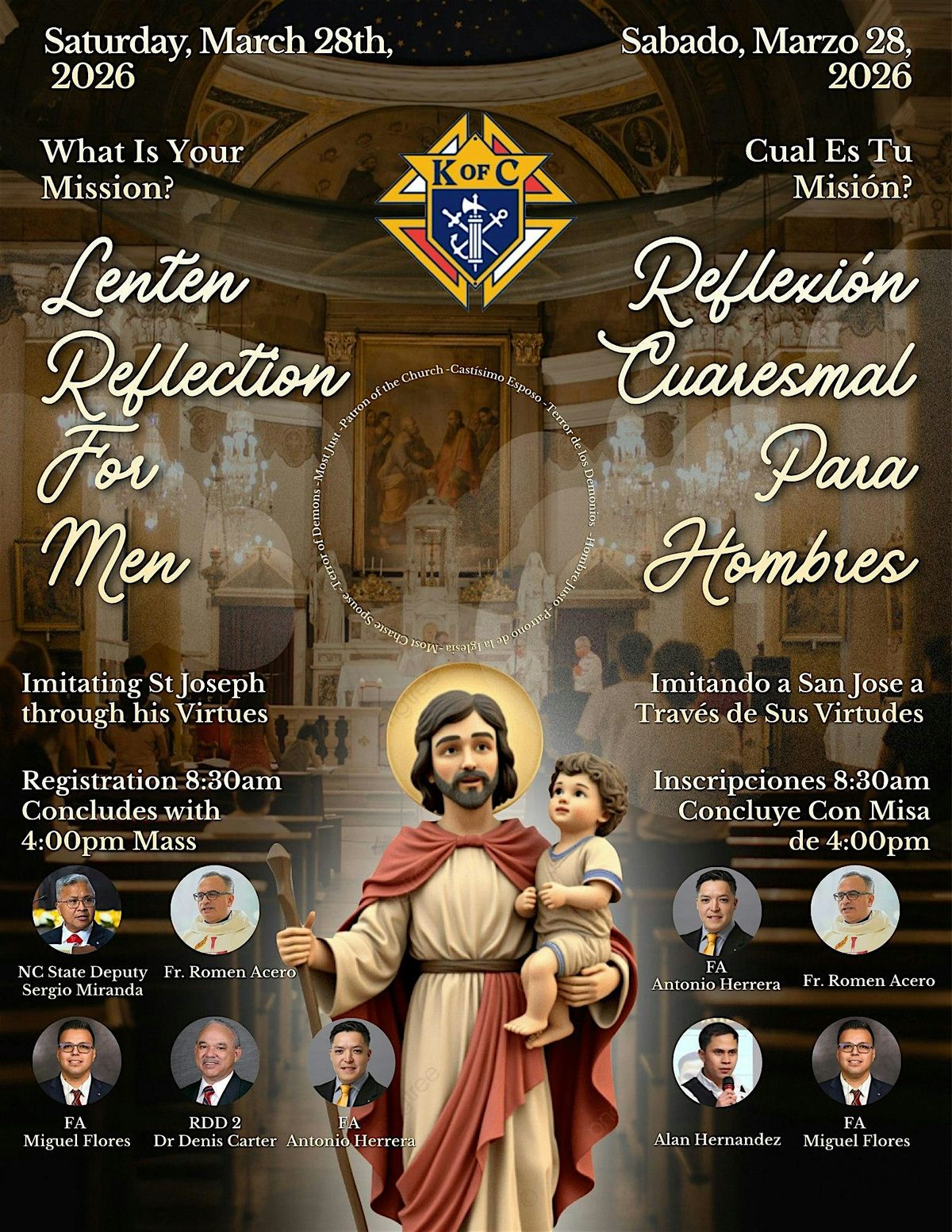 ¿Buscas profundizar tu fe esta Cuaresma? ¿Sabes cuál es tu misión? Reúnete con otros hombres para un encuentro presencial lleno de reflexión significativa, fraternidad y crecimiento espiritual. Es una gran oportunidad para relajarnos, recargar energías y enfocarnos en crecer en la virtud mientras nos preparamos para la Pascua. Nos centraremos en imitar a nuestro modelo perfecto de Padre, Esposo y Hombre, San José, a través de sus títulos de Patróno de la Iglesia, Castísimo Esposo, Hombre Justo y Terror de los Demonios. ¡No te pierdas esta experiencia!
