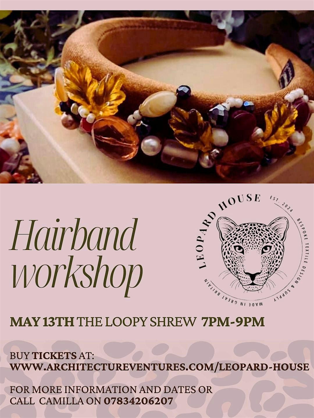 Leopard House Interiors is delighted to present a hands-on Hairband Making Workshop, perfect for anyone looking to create a stylish, handmade accessory. During the workshop, you will make your own hairband, with everything you need provided as part of the £25 ticket price. All tuition and materials are included, so no prior experience is necessary. Tea and coffee will be available throughout the session for you to enjoy as you create.