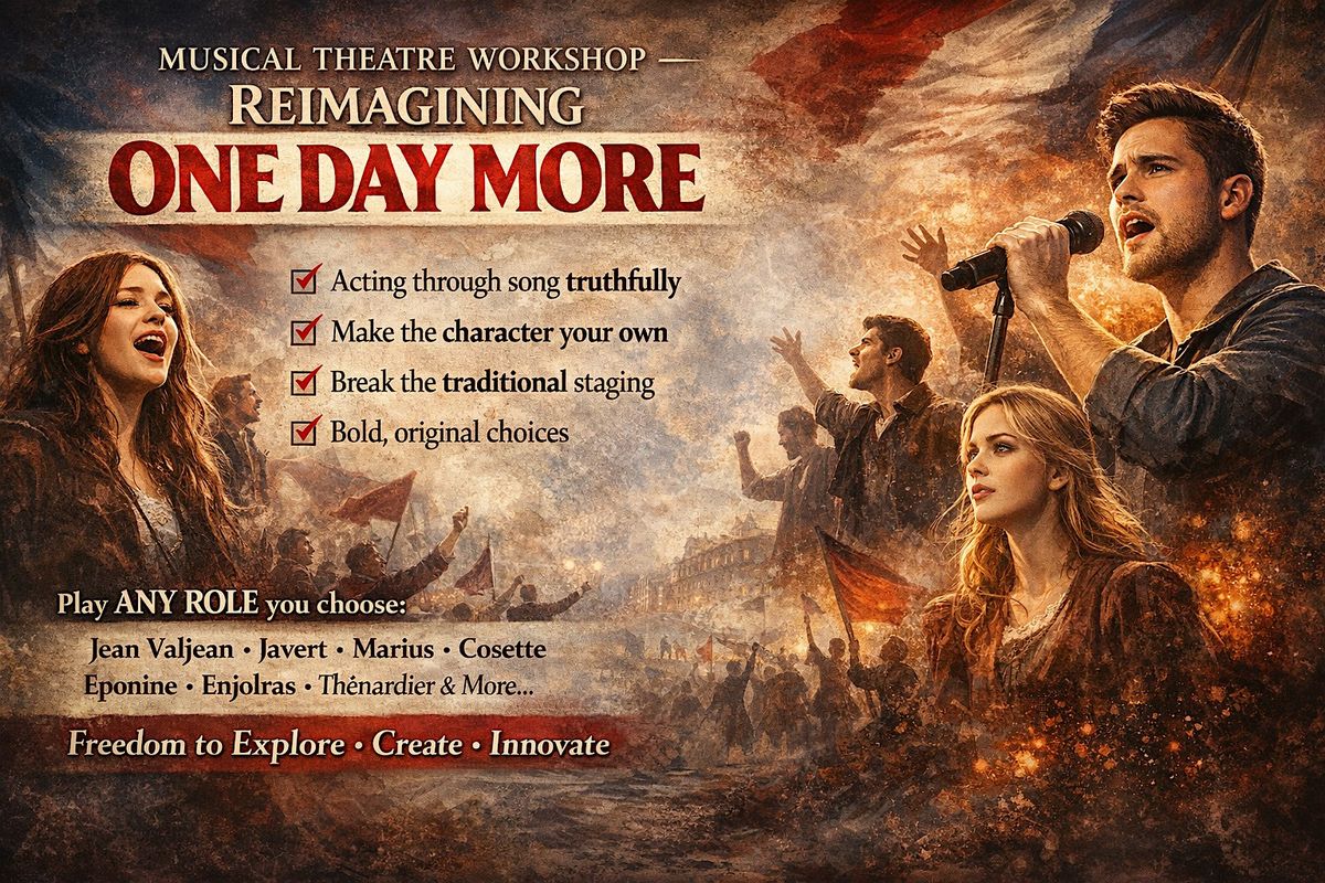 In this workshop we’ll explore the legendary ensemble number One Day More from Les Misérables — but with a twist.Rather than recreating the well-known staging from the original production, we’ll completely reimagine the song. Together we’ll explore new ways of staging it, new dynamics between characters, and bold storytelling choices that make the moment feel fresh and personal.