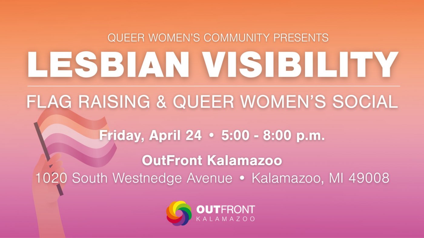 In honor of Lesbian Visibility Week, OutFront Kalamazoo's Queer Women’s Community is hosting a lesbian flag raising ceremony! All queer women and woman-aligned folks and their loved ones are invited to raise the lesbian flag with us on Friday, April 24 from 5:00 to 8:00 p.m. at OutFront Kalamazoo. Be sure to stick around afterward for a Queer Women’s Social!
