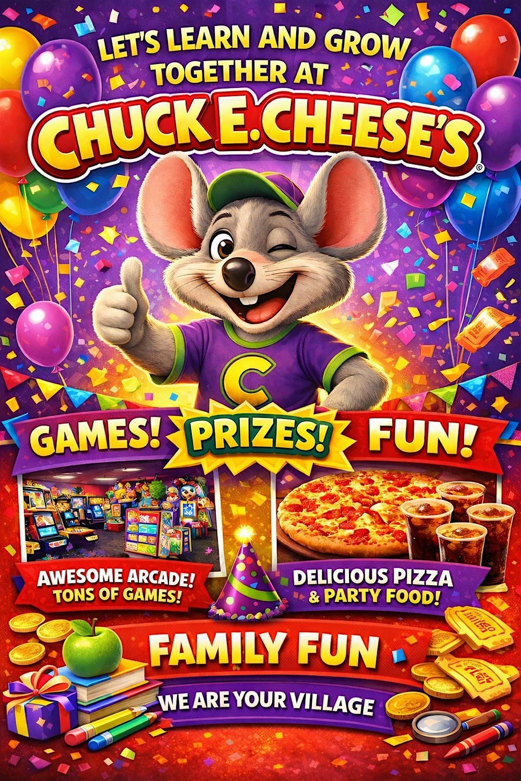 Each child attending will receive two slices of pizza, unlimited drinks, a Chuck E. Cheese goodie bag, and a Let’s Learn & Grow Together™ goodie bag.