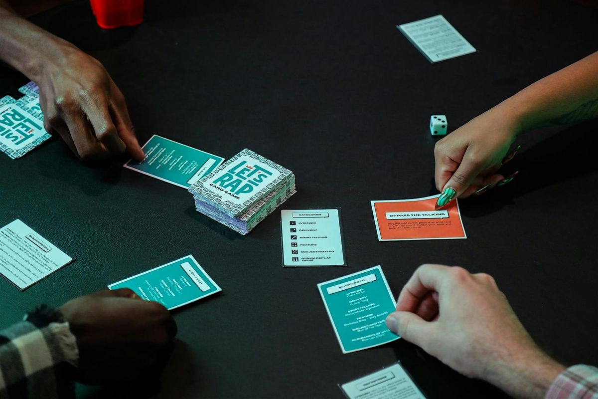 These game nights are super chill, pop-up, drop-in. You don't need a ticket to come! Bring friends and just pull up. Follow @letsrapcardgame on Instagram for more information. Games are also available for purchase at the events.