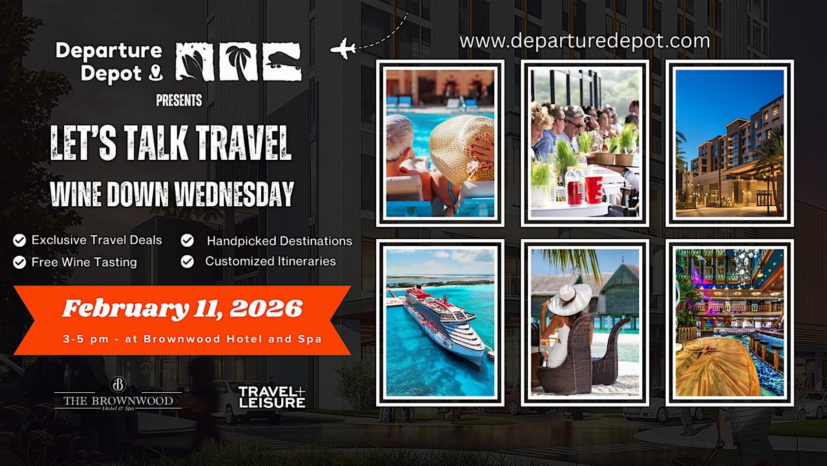 Join us for Let’s Talk Travel — Wine Down Wednesday, a relaxed, in-person wine tasting and travel discovery experience hosted by Departure Depot at the beautiful Brownwood Hotel & Spa.