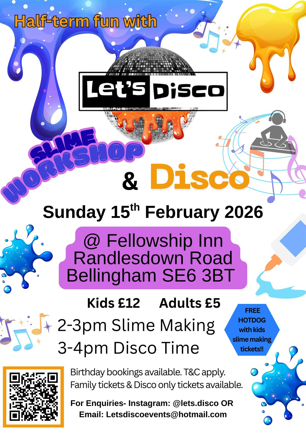 Info: If you have other children too young to do slime making, you can keep them occupied with our arts and crafts table before enjoying the disco.